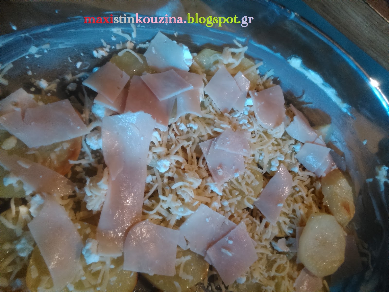 • Βουτυρώνουμε ένα μικρό πυρέξ 25x15 (περίπου), στρώνουμε τις μισές πατάτες σε σειρά, πάνω ρίχνουμε το 1/2 ζαμπόν η γαλοπούλα και το 1/3 τυρί, συνεχίζουμε με τις υπόλοιπες πατάτες. το υπόλοιπο ζαμπόν και το 1/3 τυρί.